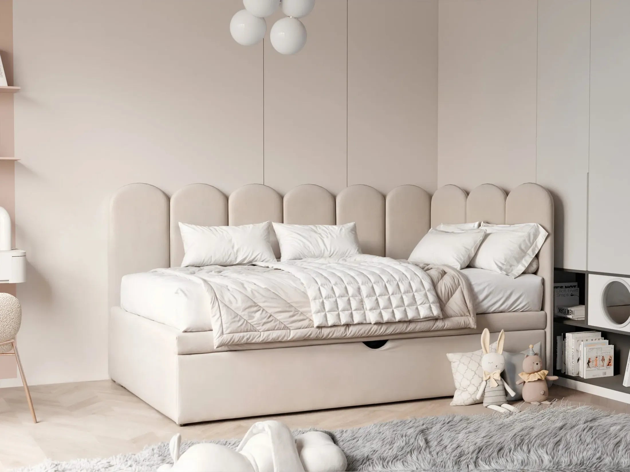 Miękkie oparcia chronią przed uderzeniami, a przytulna konstrukcja tworzy bezpieczną strefę odpoczynku i zabawy. Komfortowe materace i solidne wykonanie zapewniają zdrowy sen, a estetyczny design wprowadza do pokoju harmonię i ciepło.
